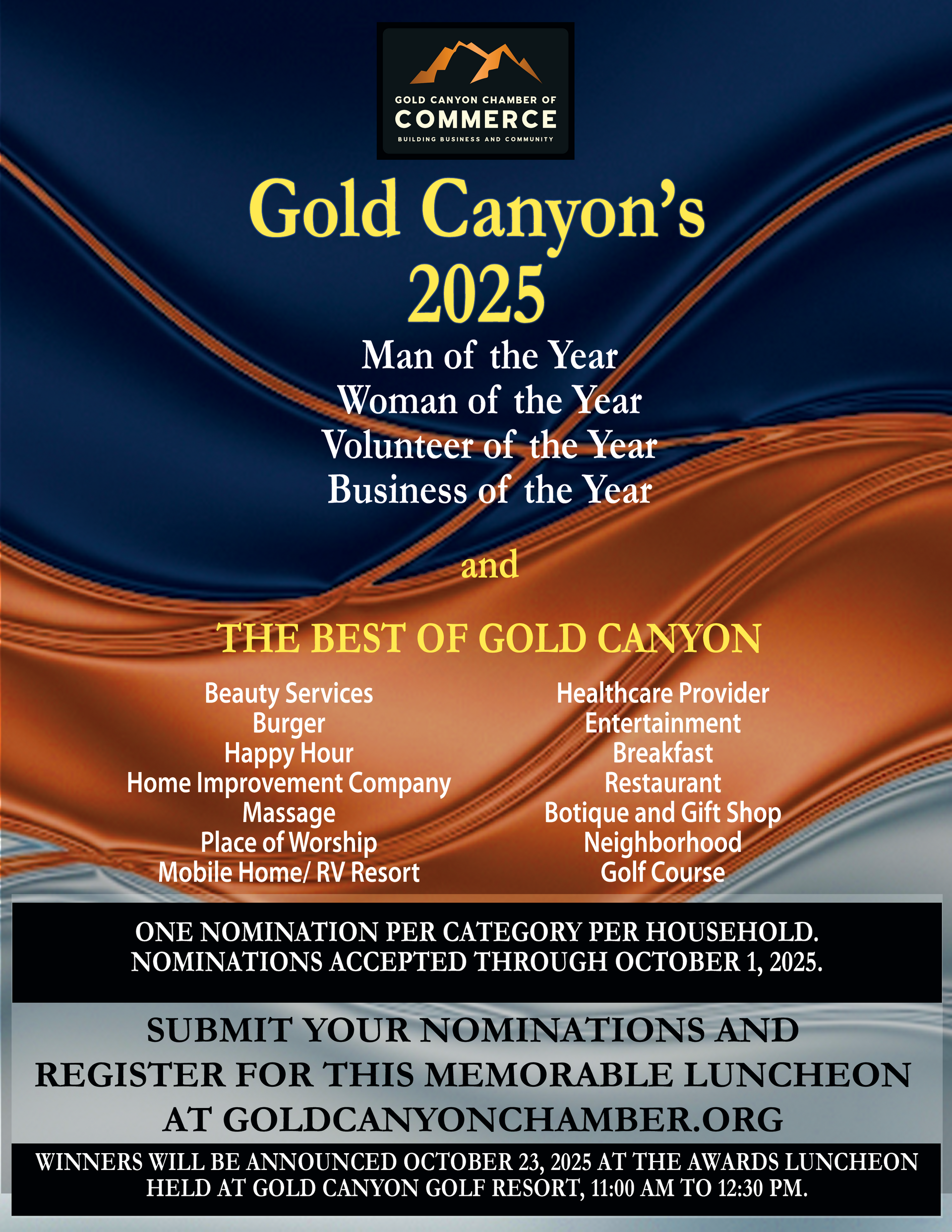 On October 23, 2025, at 11:00am, at the Gold Canyon Golf Resort, Gold Canyon residents will honor individuals who have earned the notable designation of Man of the Year, Woman of the Year, Volunteer of the Year, and Business of the Year. Awards will also be presented for The Best of Gold Canyon Categories.